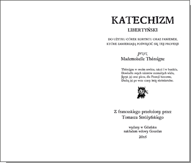 Wielka Święta Patronko Ladacznic, umocnij mego ducha i daj mi siłę rozumu, abym dobrze pojęła i zapamiętała całą wymyślność zaleceń zawartych w tym Katechizmie; spraw, bym za Twoim przykładem stała się wkrótce, dzięki praktyce, dziwką tak sławną w Paryżu, jak Ty byłaś sławna w całej Judei, i przyrzekam Ci, jako mej boskiej Patronce i Protektorce, oddać Tobie cześć i chwałę moimi pierwszymi dupczeniami. Amen.