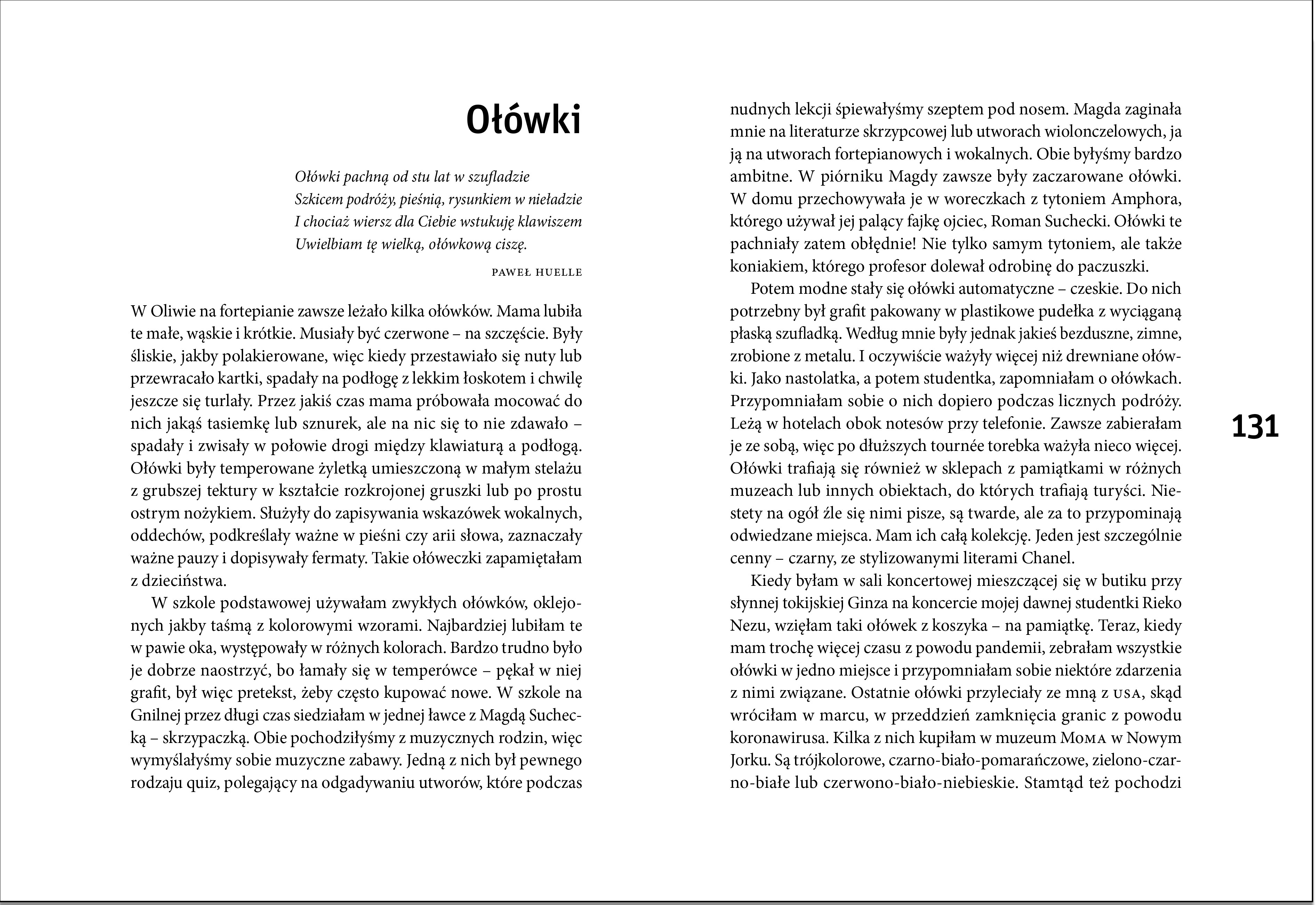Eseje wybitnej pianistki odsłaniają nie tylko charakter jej relacji z wielkimi artystami – poczynając od matki (słynnej śpiewaczki) przez Witolda Lutosławskiego i Dang Thai Sona po Jerzego Maksymiuka – lecz także osobiste opinie i poglądy oraz nierzadko bardzo zabawne anegdoty. Czytelnik wyrusza z autorką w podróż z rodzinnego domu w gdańskiej Oliwie do sal koncertowych w odległych krajach Azji i obu Ameryk.