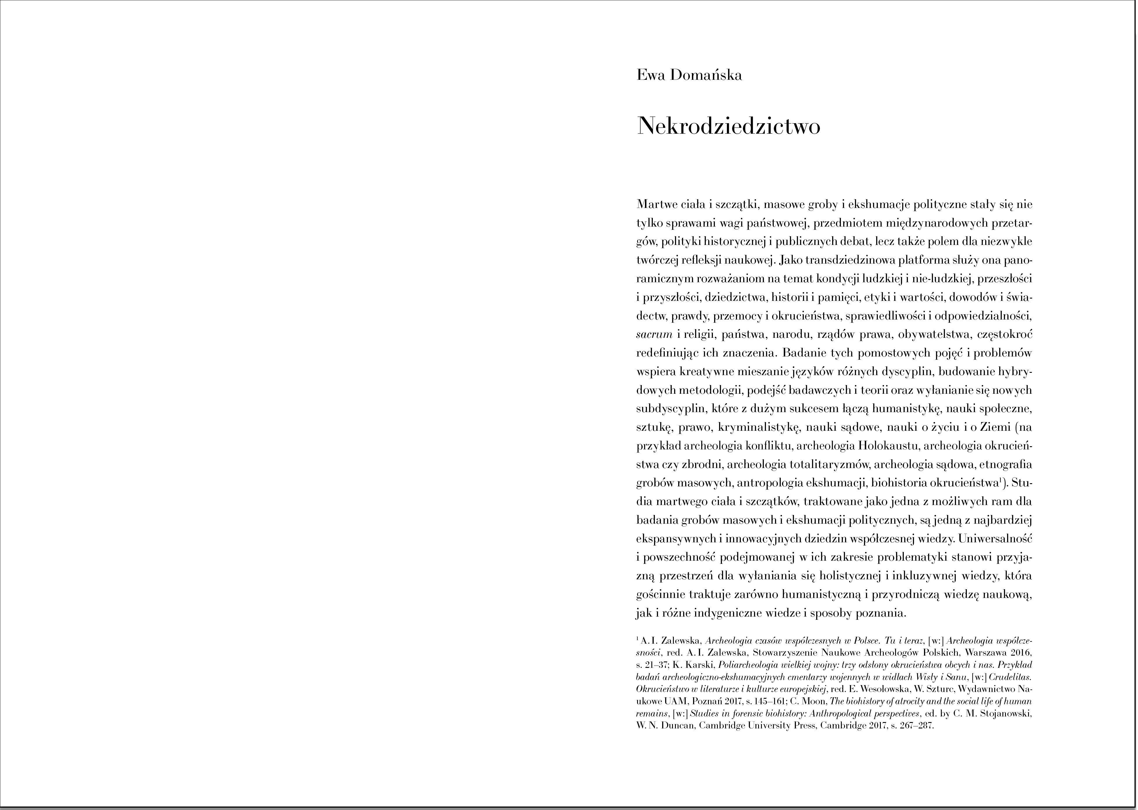 Pierwsza w Polsce publikacja dotycząca ekshumacji politycznych, które zostały ukazane w perspektywie zarówno globalnej, jak i lokalnej, humanistycznej i przyrodniczej. Zebrane w książce artykuły oferują innowacyjne i panoramiczne ujęcie rozmaitych przypadków ekshumacji politycznych i praktyk odsłaniania grobów. Wiążą różne zdarzenia, ludzi i miejsca, a także teorie, metody i tendencje badawcze. Praca włącza się w dynamicznie rozwijające się w Polsce i na świecie studia nad martwym ciałem i szczątkami, badania grobów masowych i ekshumacji, które traktowane są jako wyznaczniki kondycji współczesnego świata i człowieka.