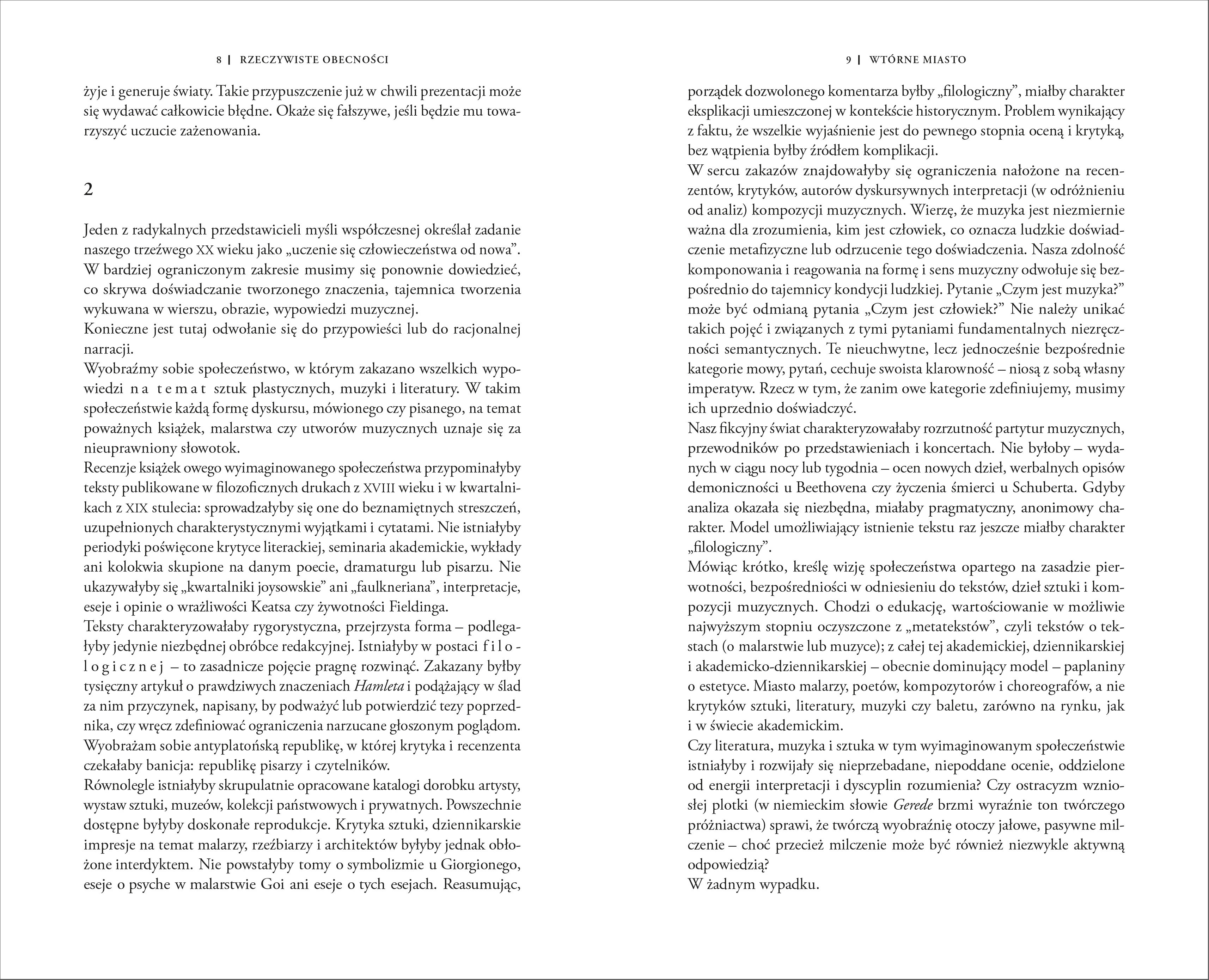George Steiner – literaturoznawca, komparatysta, badacz kultury, poliglota, nade wszystko jednak filolog – w wydanych niespełna trzydzieści pięć lat temu Rzeczywistych obecnościach wysunął tezę o konieczności istnienia transcendencji, o ile ma istnieć wielka sztuka, wielka literatura. Według niego bowiem istnienie wielkiej sztuki i literatury – oryginalnej, a przy tym wpisanej w nurt historii sztuki czy literatury – jest warunkiem sine qua non człowieczeństwa. Dążenie do spotkania autentycznego, do twórczości znaczącej, zdolnej stawiać pytania i nieść z sobą istotne odpowiedzi, ma być zadaniem sztuki odpowiedzialnej i odpowiadającej (responsible and answerable). Stąd sprzeciw George’a Steinera wobec wtórności i trzeciorzędności – sztuki, literatury, teatru i nauki. Stąd jego wielokrotnie powtarzane wołanie o likwidację słabego systemu kształcenia, wtórności badań naukowych, powtarzalności kolejnych od-twórczych, nie-oryginalnych prac (to chyba najmocniejsze – i mimo upływu czasu nietracące na aktualności – oskarżenie pod adresem słabych szkół, słabych uniwersytetów, słabych systemów edukacyjnych). Jako komparatysta był świadom wagi tradycji, pierwotnych mitów i tekstów kultury, których twórcze odczytywanie na nowo – poprzez nowe arcydzieła – było niezbędne, jeśli wielkie dzieła miały nadal powstawać. Dlatego właśnie zarzucano czasem Steinerowi, że ignoruje nurty marginalizowane, że chciałby odebrać głos tym, którzy mówią w imieniu grup pomijanych, wykluczanych czy uciszanych. Nie dostrzegał tych zarzutów i nie doceniał ich znaczenia. Ale był przecież adwokatem powagi – powagi Logosu, powagi dzieła, powagi sztuki – i domagał się wybitności jako jedynego kryterium wartości, a jednocześnie sposobu dotarcia do sensu ludzkiego bycia.