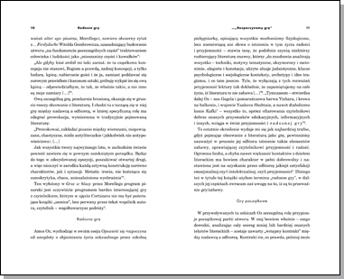 Obcowanie z literaturą to jednocześnie gra i zabawa. Sięgając po dzieło literackie, podpisujemy pakt, ustalamy pewne reguły gry, co nie znaczy oczywiście, że nie możemy ich w trakcie lektury złamać lub odrzucić. Zdarza się również, że książka sama manipuluje uzgodnionymi zasadami – zwodzi fikcją i autentyzmem, myli tropy, odwołuje się do inteligencji, a czasem nawet cierpliwości czytelnika. Autorka próbuje opisać mechanizmy literackich igraszek, w których uczestniczymy na różnych poziomach: języka, fikcji czy świata przedstawionego (zwłaszcza fabuły). W końcu same książki, dzięki intertekstualnym nawiązaniom, zagadkom czy cytatom, również nie najgorzej się bawią…