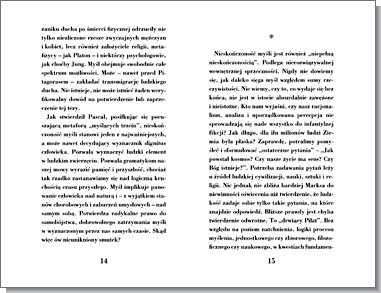 "Ludzka egzystencja, życie umysłu jest równoznaczna z doświadczaniem melancholii i żywotnej zdolności jej przezwyciężania. Można stwierdzić, że rodząc się, zostajemy naznaczeni stygmatem smutku..." Esej jest próbą odpowiedzi na pytanie, dlaczego z procesem myślowym wiąże się nierozerwalnie melancholia, dlaczego myśl człowieka nie wiąże się z radością.