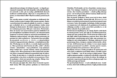 Nie wszystkie ważne słowa ze spotkania z Grotowskim zostały tu powtórzone „z pamięci”. Inne – te, o których pamięć nie pamiętała – pochodzą z notatek robionych pospiesznie przez niektórych uczestników rozmowy. Tak oto dwie zbieżne formy przetrwania – pamięć i pismo – przedłużyły czas istnienia wypowiedzianych niegdyś słów. A przedłużając – przemieniły.